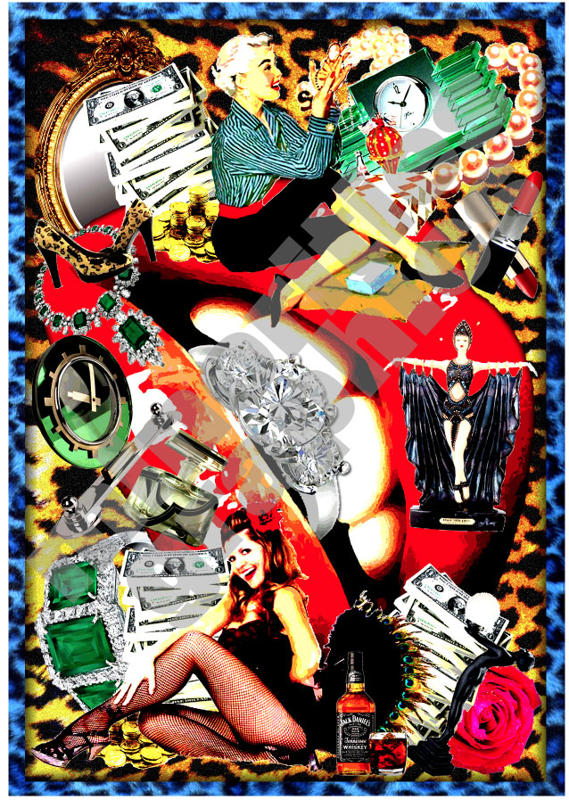 ダイヤの指輪をくわえた唇を中心に様々なものが詰め込まれて